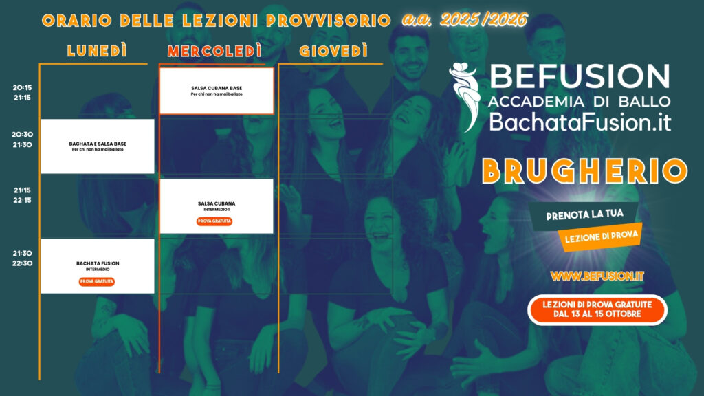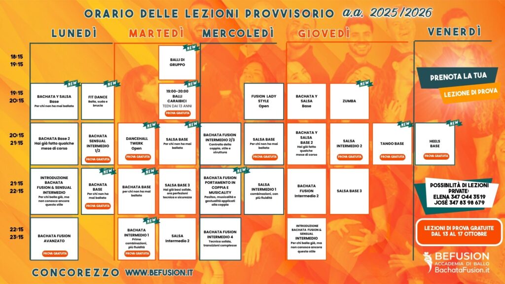 ECCELLENTE In base a 45 recensioni Pubblicato su Claudio DepontiTrustindex verifica che la fonte originale della recensione sia Google. Insegnanti BRAVISSIMI . Pazienti a spiegare e se lo dico io che ero un tronco , fidatevi. Dei veri PROFESSIONISTI.Pubblicato su Alessio GuercioTrustindex verifica che la fonte originale della recensione sia Google. Se vuoi passare delle ore rilassanti e nel segno dell'ilarità dopo una giornata lavorativa, imparando a ballare in maniera professionale, sei nel posto giusto! Consigliata!Pubblicato su Maria Teresa ViganoTrustindex verifica che la fonte originale della recensione sia Google. Bravissimi maestri,💃🕺ambiente familiare ,direi🔝🔝🔝🔝🎉🎉Pubblicato su kika bumTrustindex verifica che la fonte originale della recensione sia Google. Se voglio imparare un ballo meglio andare da bravi maestri, mi sono detta. E così sono andata ta da loro. Ho iniziato Bachata fusion e oggi se potessi sarei lì tutti giorni! Adoro José ed Elena: tecnica, musicalità, uno stile unico, passione e divertimento che si trasmettono agli allievi. Ti accorgi di crescere e migliorare ad ogni lezione. E poi si fa gruppo ed organizzano serate ed eventi. Per me top! 🔝💚Pubblicato su Noemi AngelosantoTrustindex verifica che la fonte originale della recensione sia Google. Maestri d’eccellenza e atmosfera frizzante, è questo il segreto della Be Fusion family….se vuoi divertirti e rigenerare la tua energia “sensual” sei nel posto giustoPubblicato su Riccardo ColellaTrustindex verifica che la fonte originale della recensione sia Google. Beh c’è poco da dire… i numeri uno della bachata! Estremamente tecnici e competenti! Non posso far altro che consigliare!